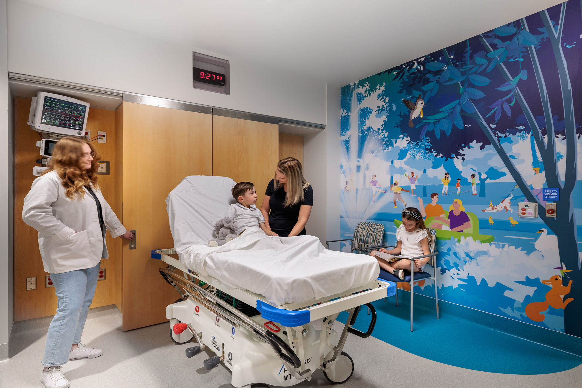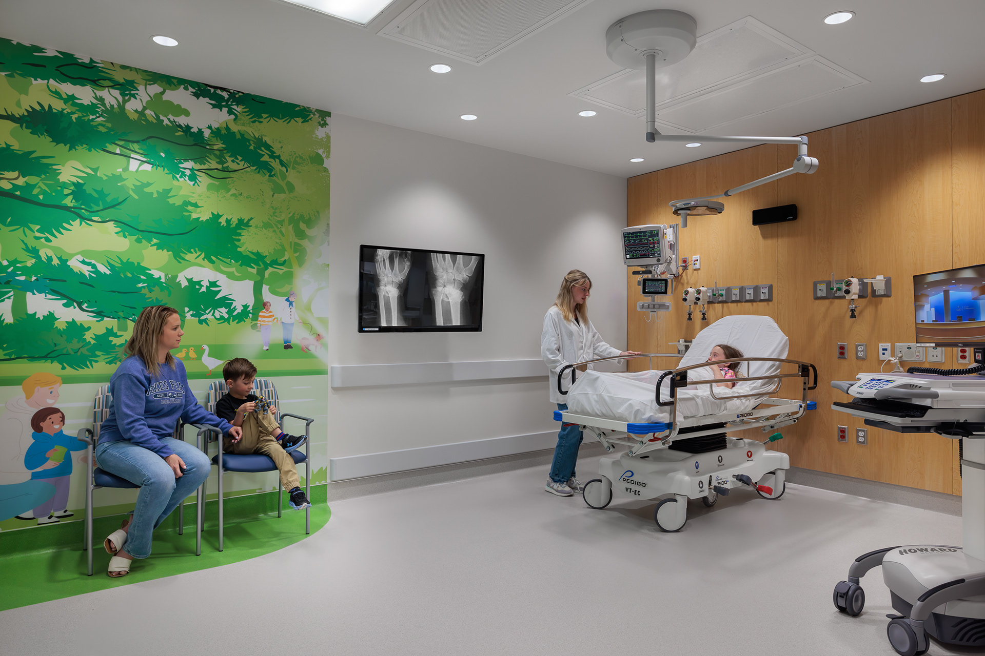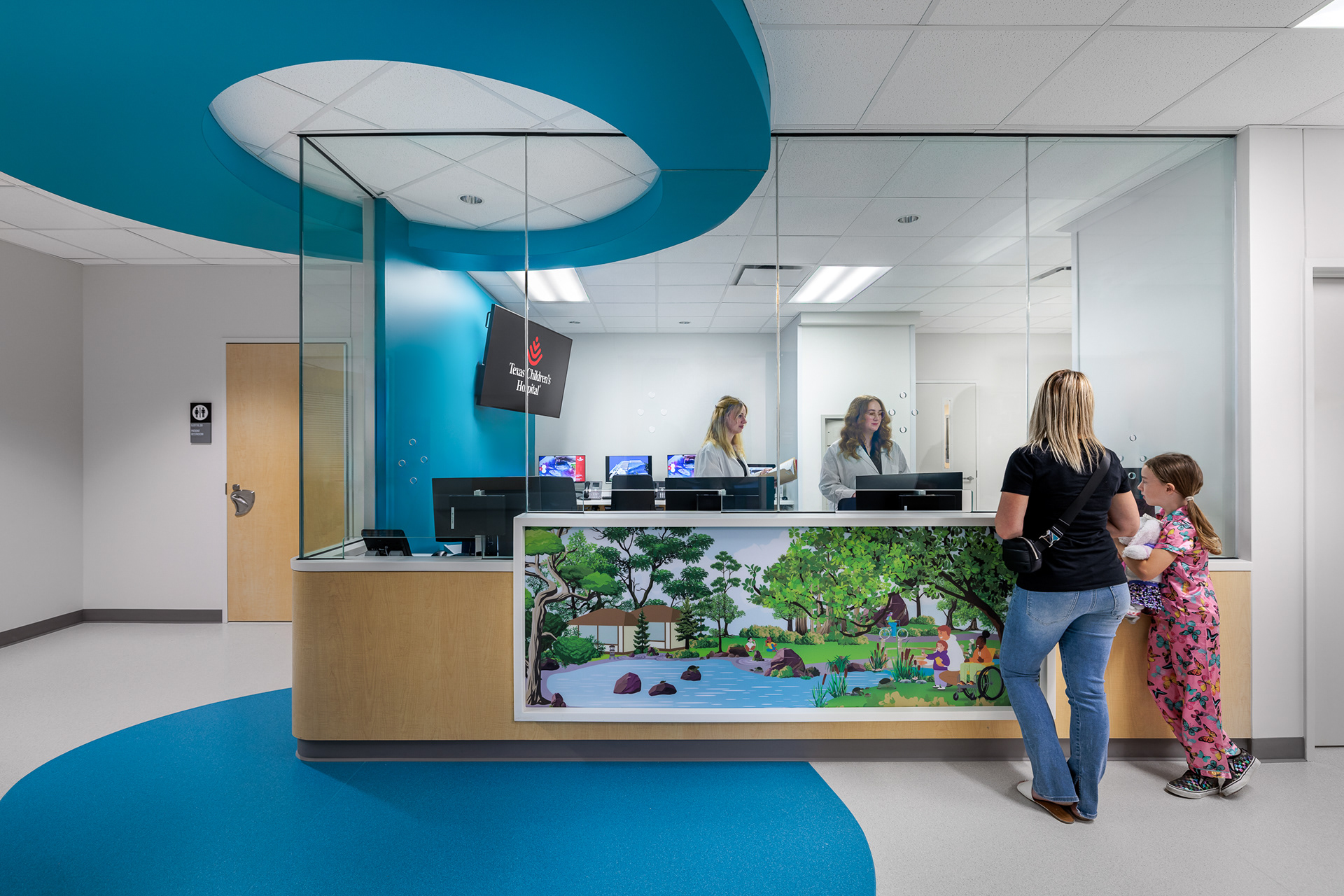 Environmental graphic design for the 14,000 sq ft addition of the West Tower Level 1 Emergency Center at Texas Children's Hospital. Exam graphics and team station desks feature stylized compositions of iconic Houston landmarks to create a recognizable scene for visitors and connect the space with its local context. Completed in 2024 with CannonDesign.