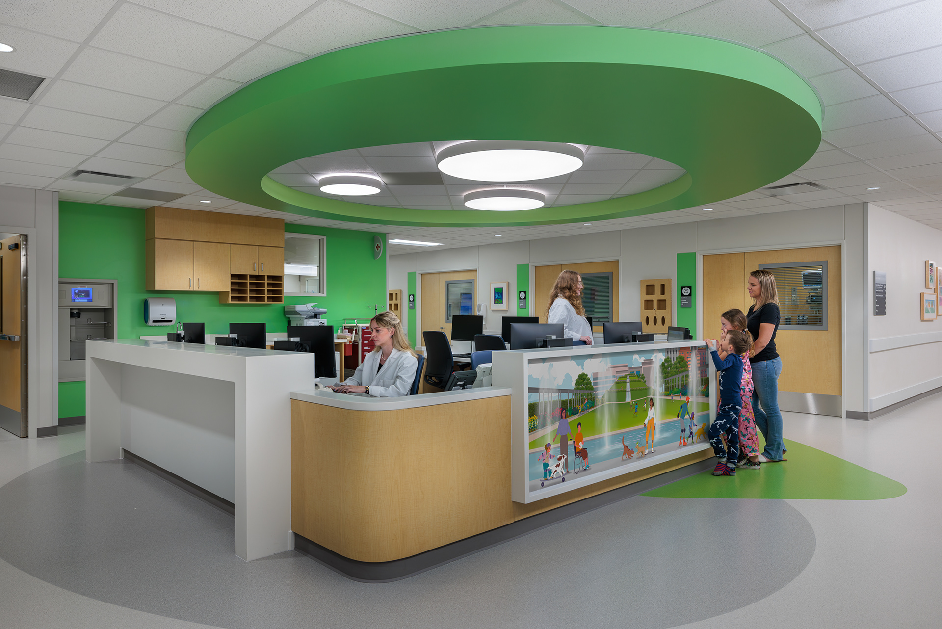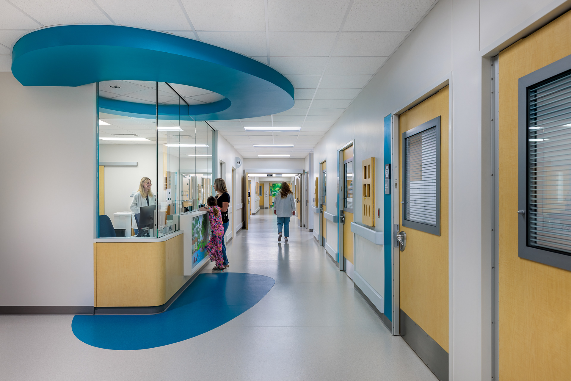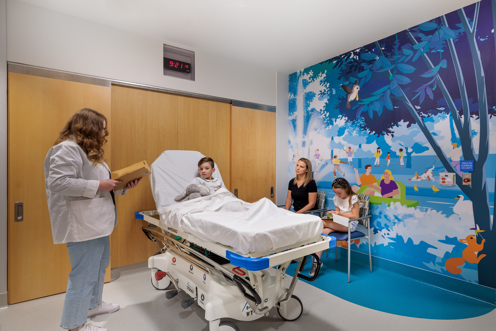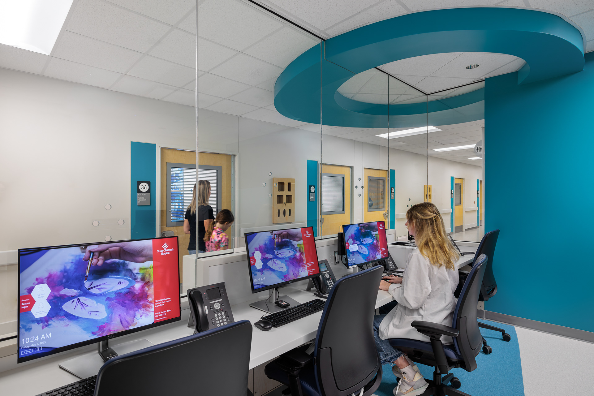 Environmental graphic design for the 14,000 sq ft addition of the West Tower Level 1 Emergency Center at Texas Children's Hospital. Exam graphics and team station desks feature stylized compositions of iconic Houston landmarks to create a recognizable scene for visitors and connect the space with its local context. Completed in 2024 with CannonDesign.