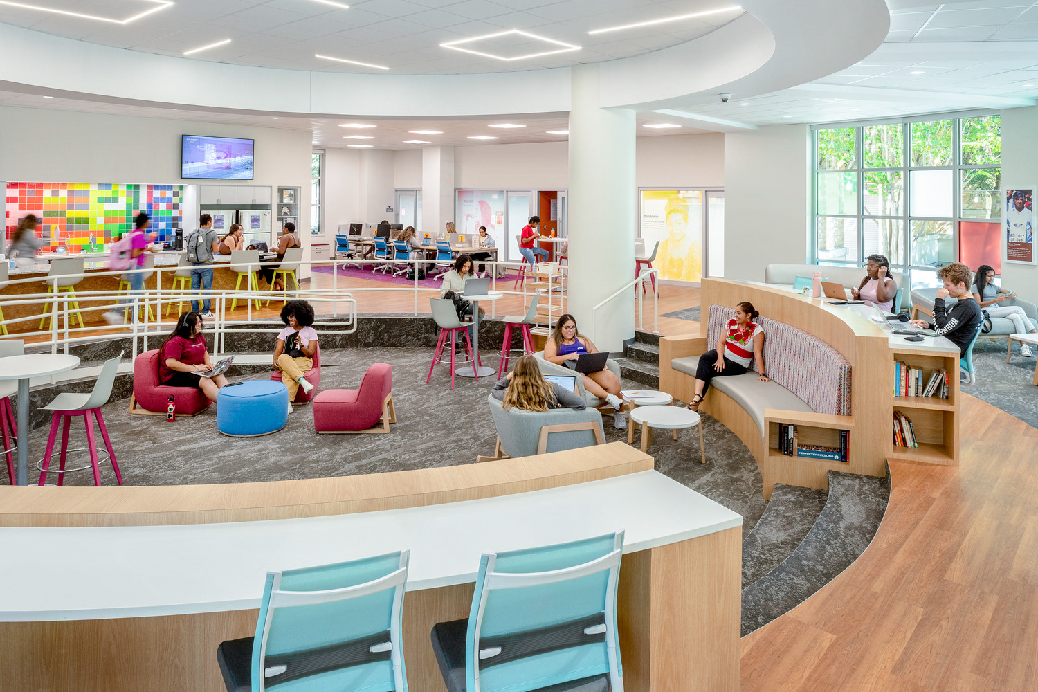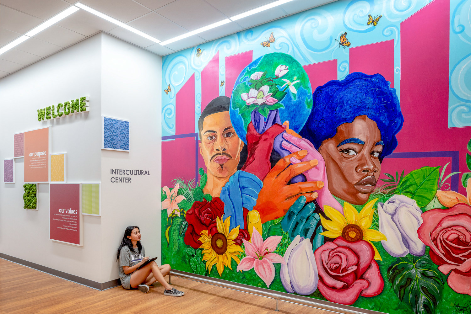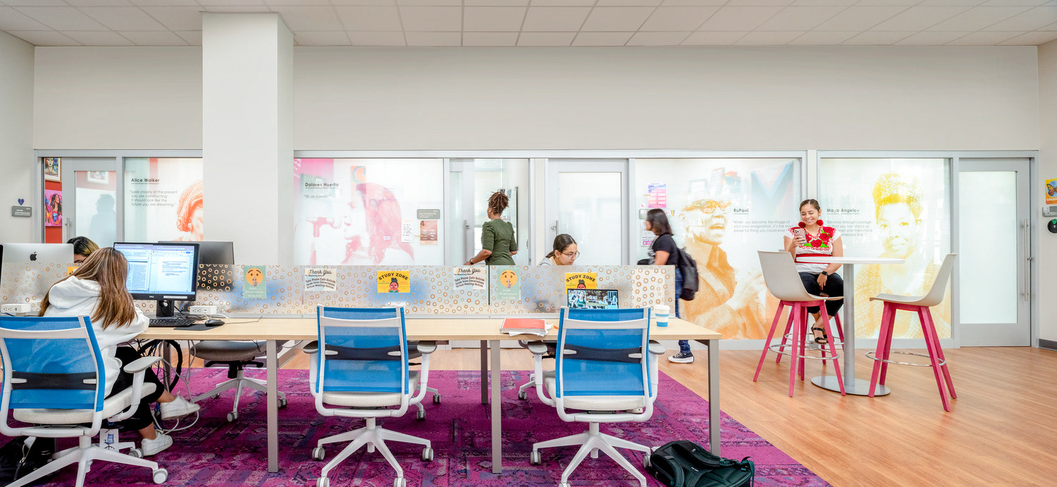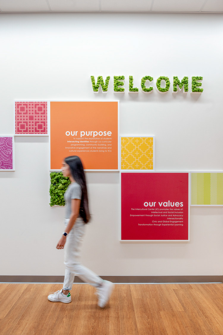 The Texas Christian University’s Intercultural Center is a dynamic space designed to be welcoming and comfortable for underrepresented communities, establishing a home where they feel seen, heard and celebrated. Outfitted with vibrant colors, unapologetic representation and mixed-use areas, the TCU ICC is a multi-cultural hub of student-led activities that recognize and appreciate underrepresented identities. Environmental graphic design completed with CannonDesign in 2021.